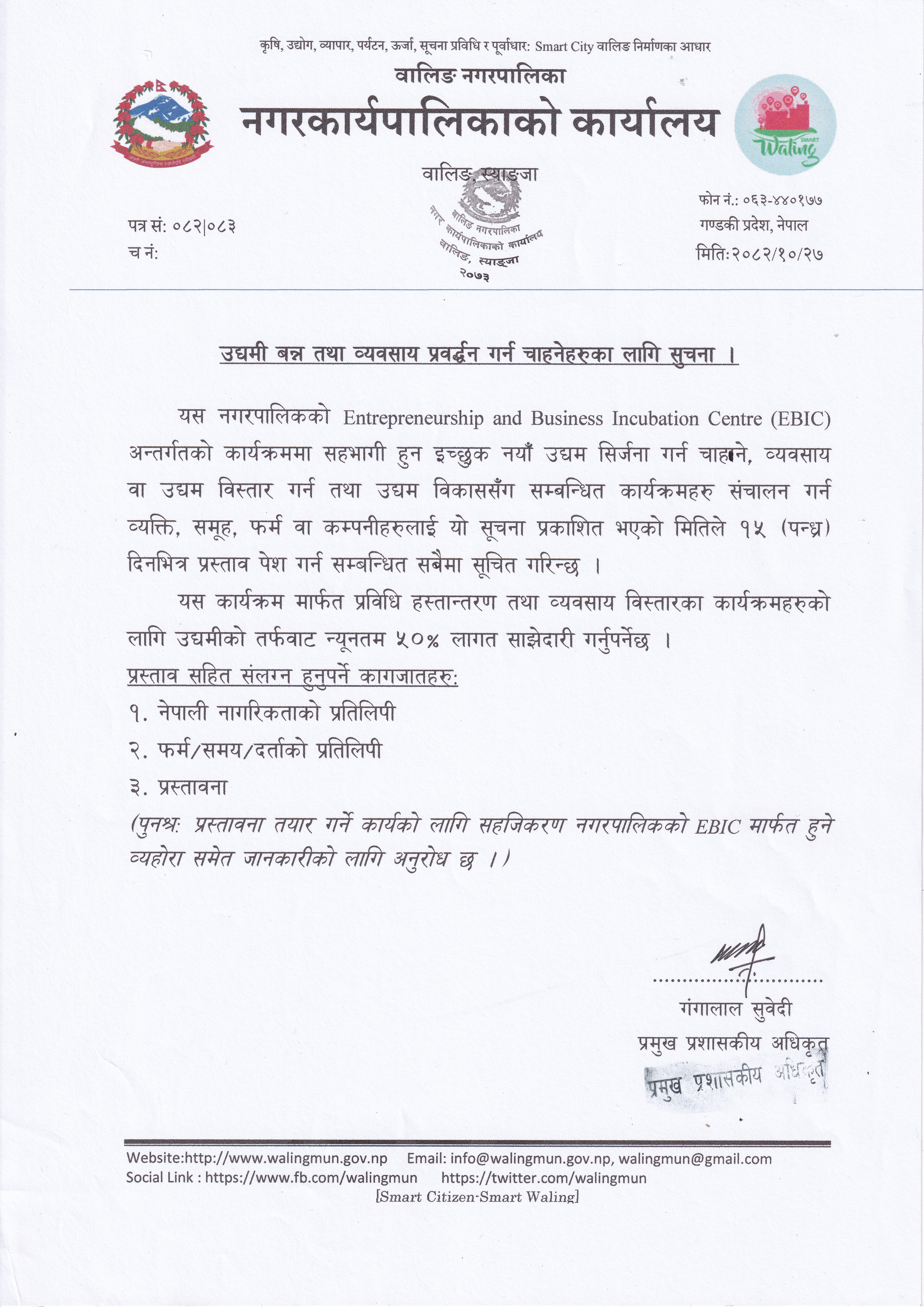 वालिङ नगरपालिका कार्यालय, स्याङजाको फोहर व्यवस्थापन सम्बन्धी प्रस्ताव आव्हानको सूचना