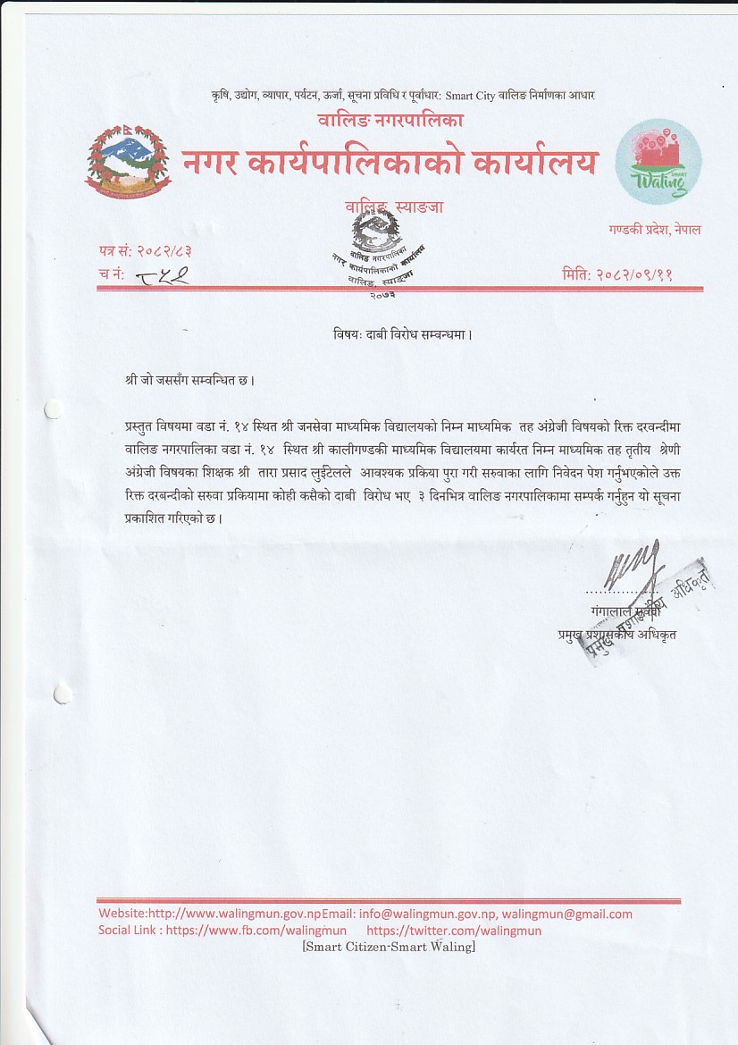 वालिङ नगरपालिका कार्यालय, स्याङजाको फोहर व्यवस्थापन सम्बन्धी प्रस्ताव आव्हानको सूचना