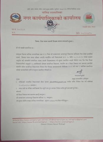 वालिङ नगरपालिका कार्यालय, स्याङजाको फोहर व्यवस्थापन सम्बन्धी प्रस्ताव आव्हानको सूचना