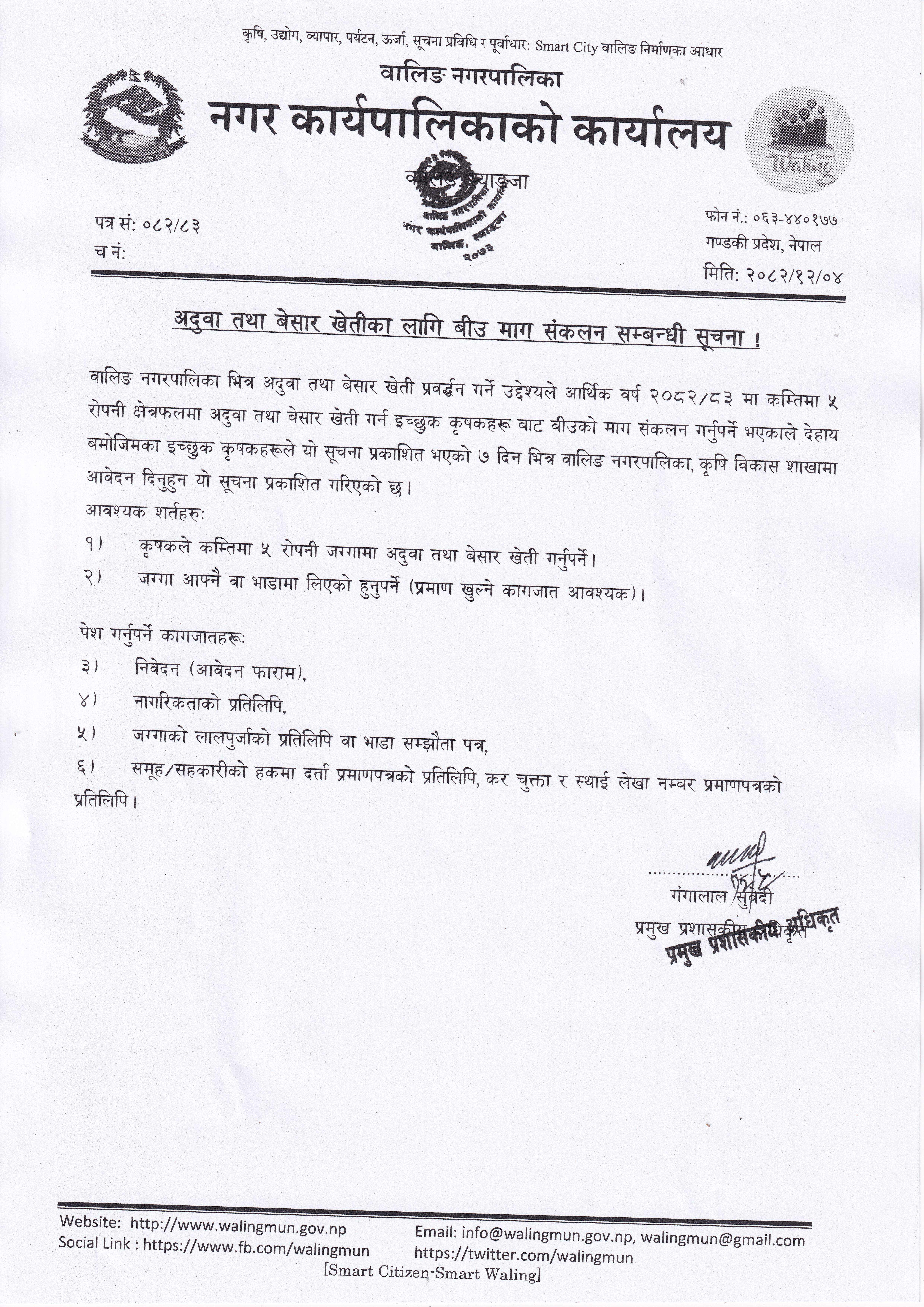 वालिङ नगरपालिका कार्यालय, स्याङजाको फोहर व्यवस्थापन सम्बन्धी प्रस्ताव आव्हानको सूचना