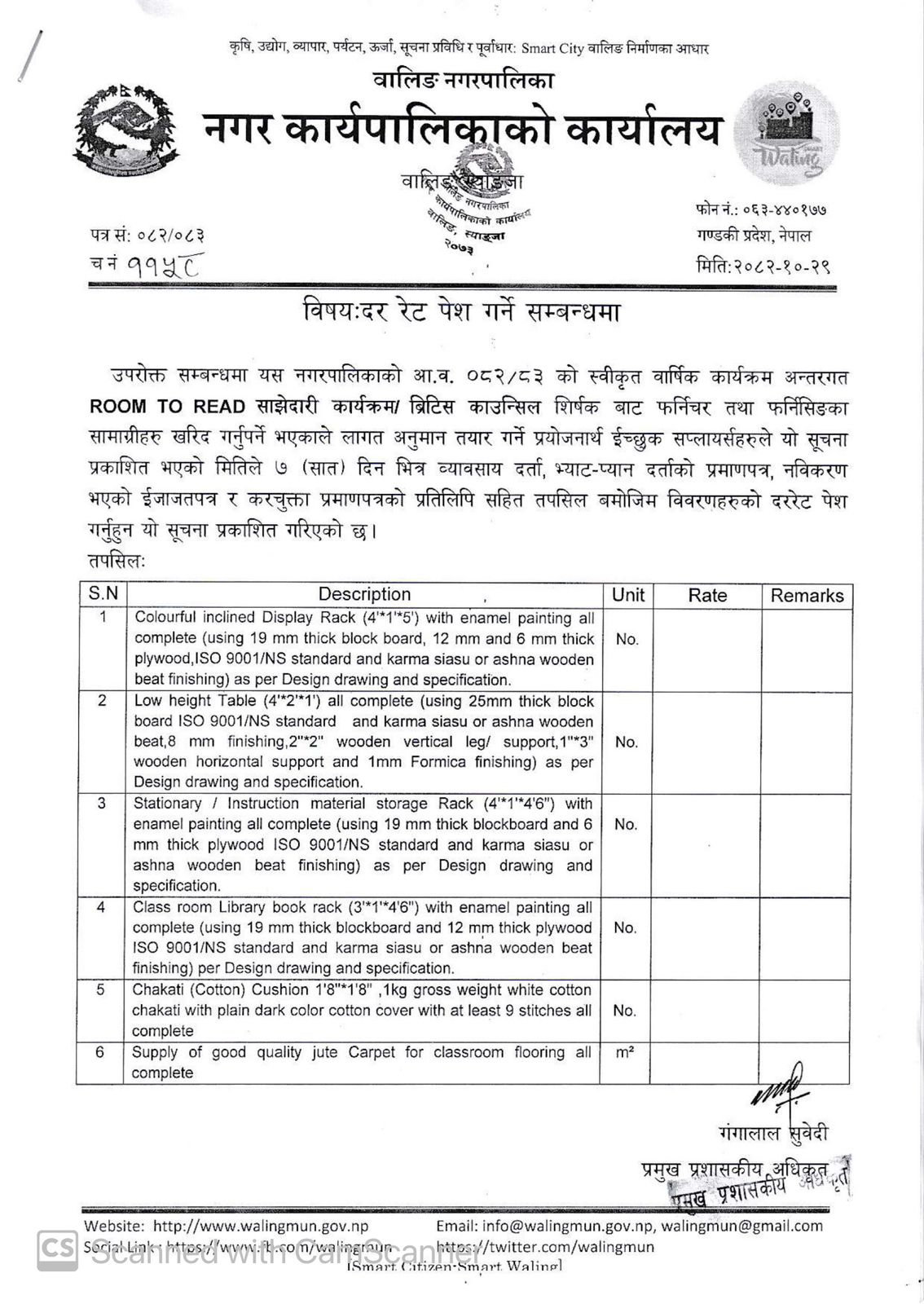 वालिङ नगरपालिका कार्यालय, स्याङजाको फोहर व्यवस्थापन सम्बन्धी प्रस्ताव आव्हानको सूचना