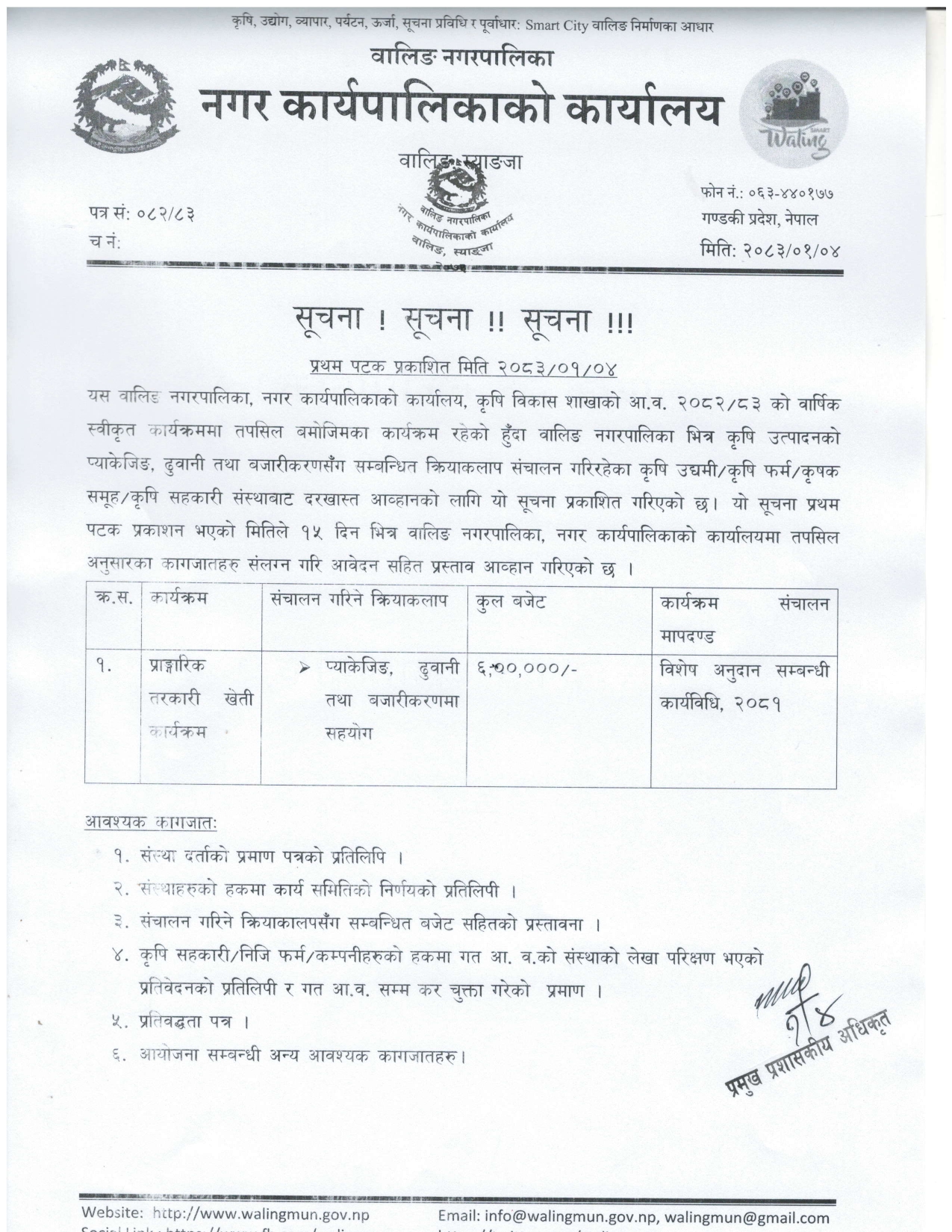 वालिङ नगरपालिका कार्यालय, स्याङजाको फोहर व्यवस्थापन सम्बन्धी प्रस्ताव आव्हानको सूचना