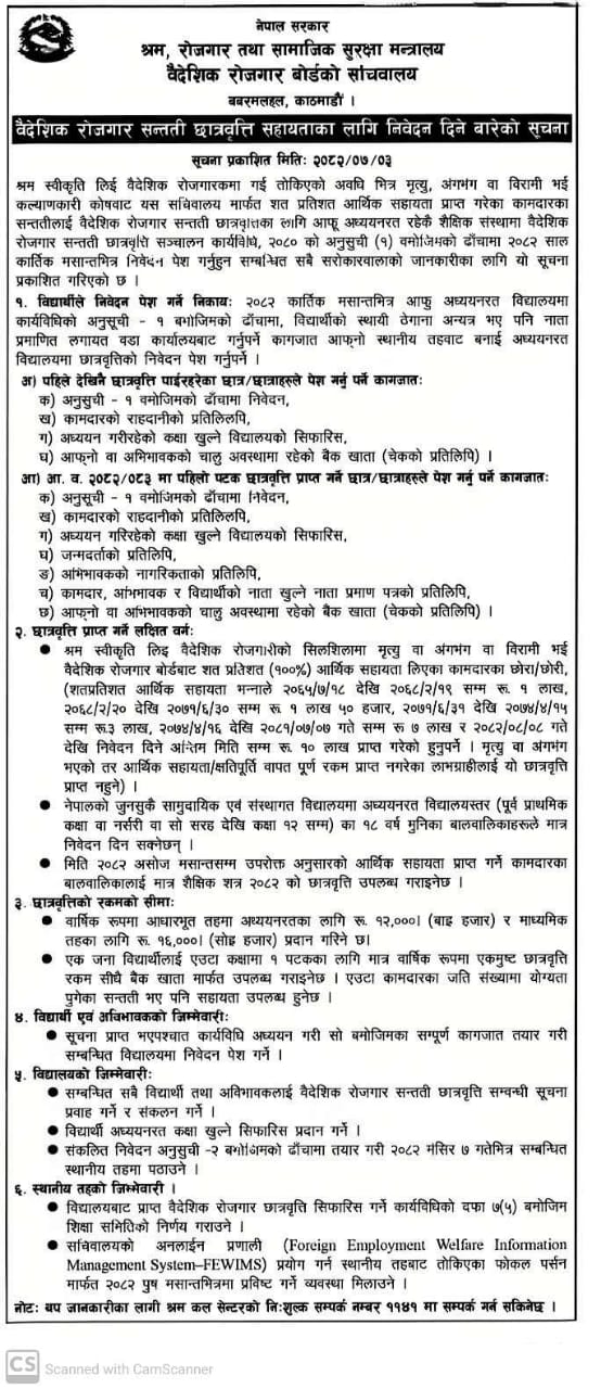 वैदेशिक रोजगार सन्तति छात्रवृत्ति कार्यक्रममा सहभागी हुने सम्बन्धी सूचना।